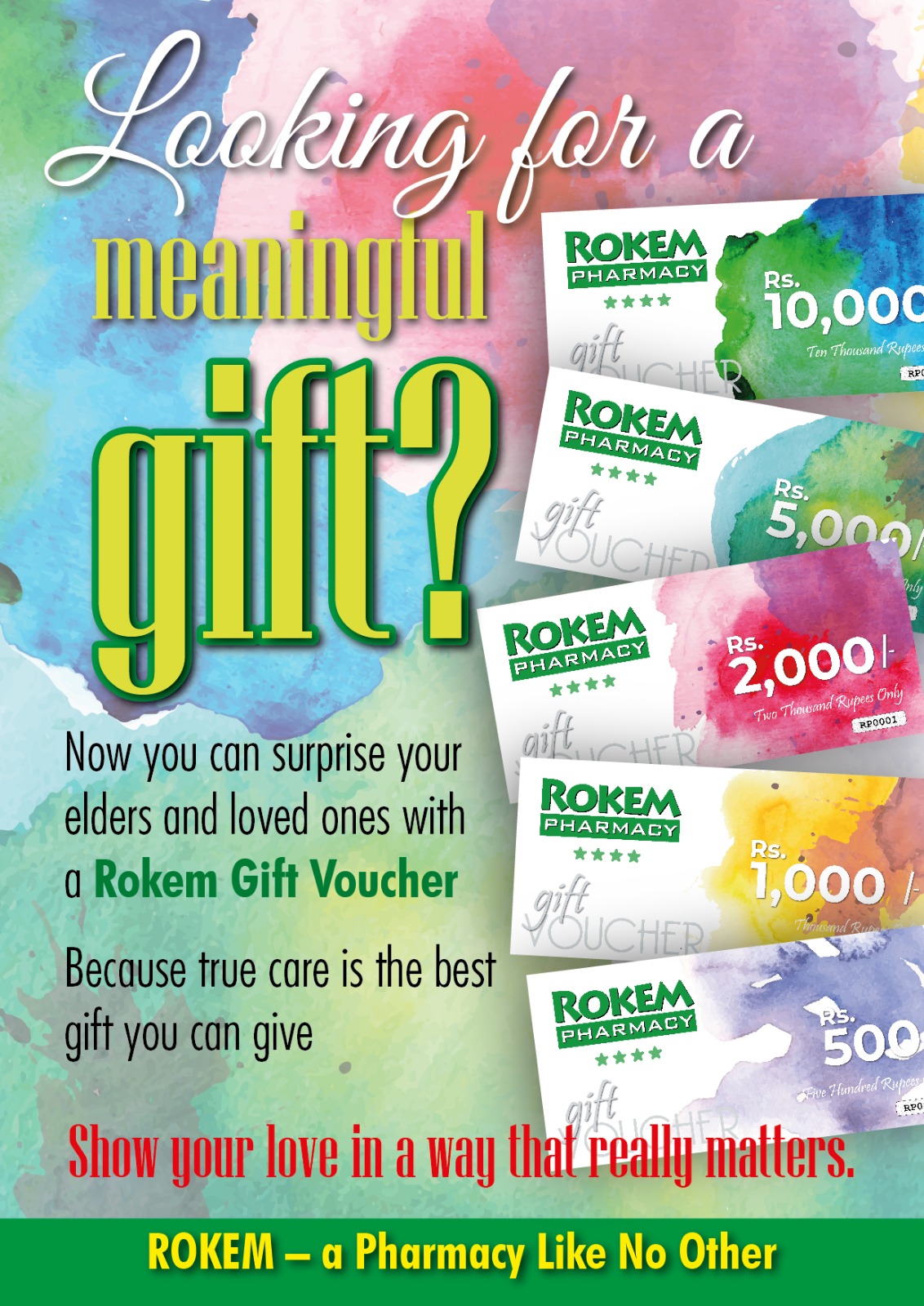 Available in multiple values β Rs. 1,000, Rs. 2,000, Rs. 5,000, and Rs. 10,000 β our vouchers are ideal for birthdays, celebrations, or simply supporting the everyday healthcare needs of your family.